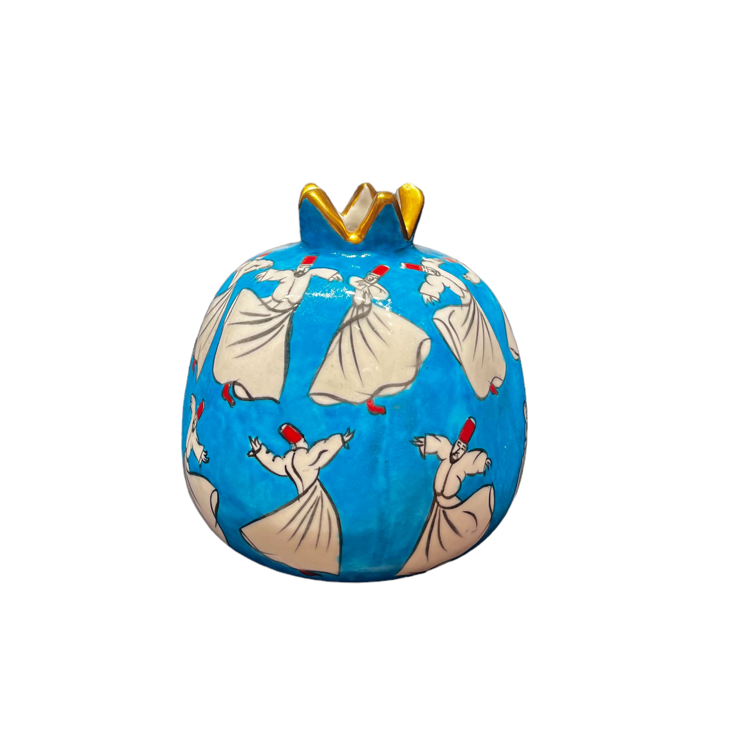This ceramic pomegranate is adorned with a dervish motif, making it a special piece of art. The dervish figure symbolizes inner peace, wisdom, and spiritual pursuit. Handcrafted with intricate details, this design adds depth and visual appeal to the piece. The pomegranate motif, known for symbolizing fertility and abundance, holds significant cultural importance in Turkish tradition.