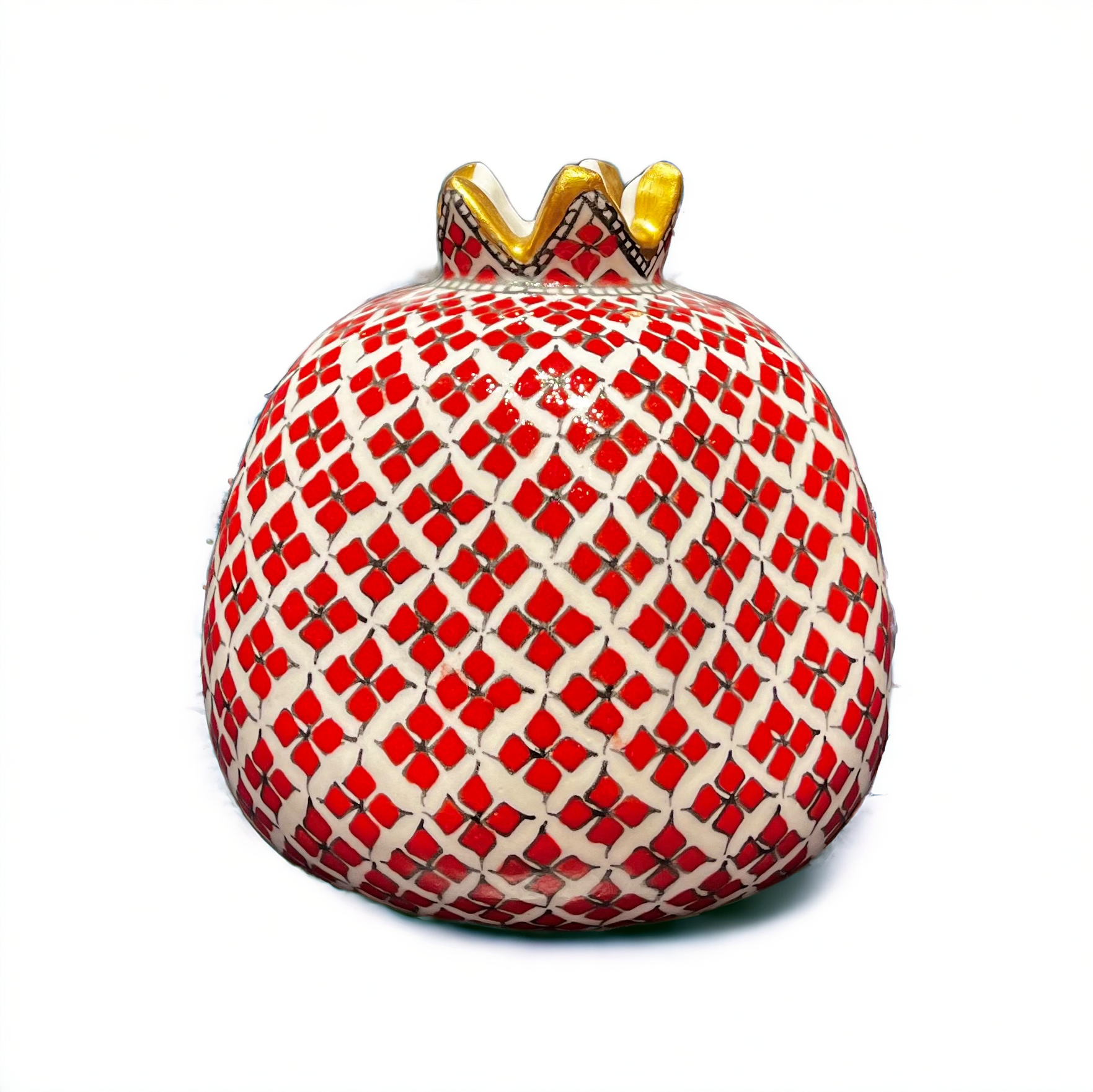 This quartz pomegranate adorned with geometric red clover designs. This meticulously crafted piece merges traditional geometric patterns with the symbolic red clover motif, known for its cultural significance and aesthetic appeal. Perfect for both decorative display and functional use, it adds a touch of sophistication and artistry to any setting, making it a statement piece in your decor."