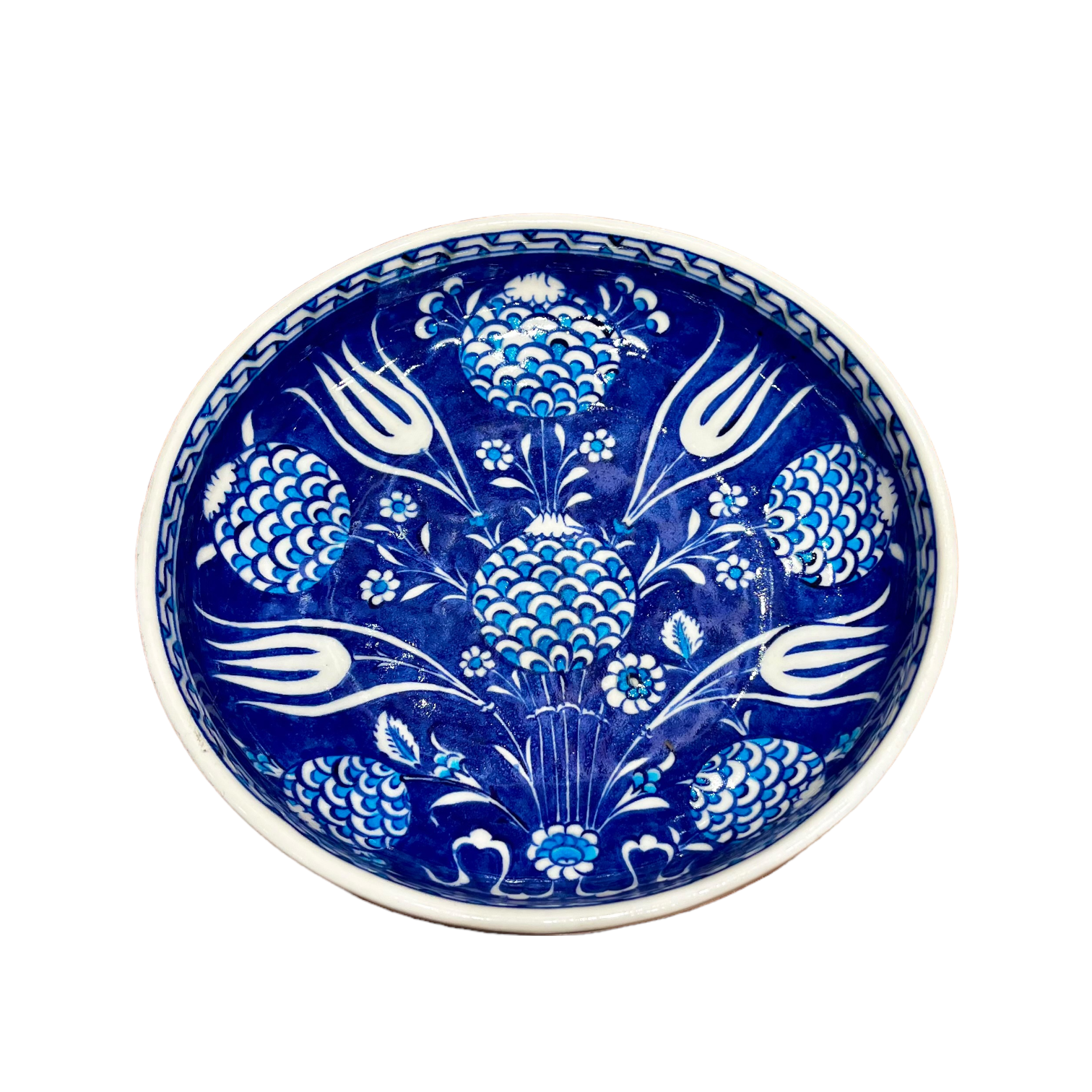 A bowl adorned with tulip and pomegranate patterns on a blue background, suitable for everyday use. This handcrafted item showcases the beauty of traditional Turkish ceramic artistry with its intricate floral motifs. The combination of tulips and pomegranates on the blue background adds a vibrant and cultural touch to the bowl, making it perfect for serving various dishes while also enhancing the aesthetic appeal of any dining or display setting.