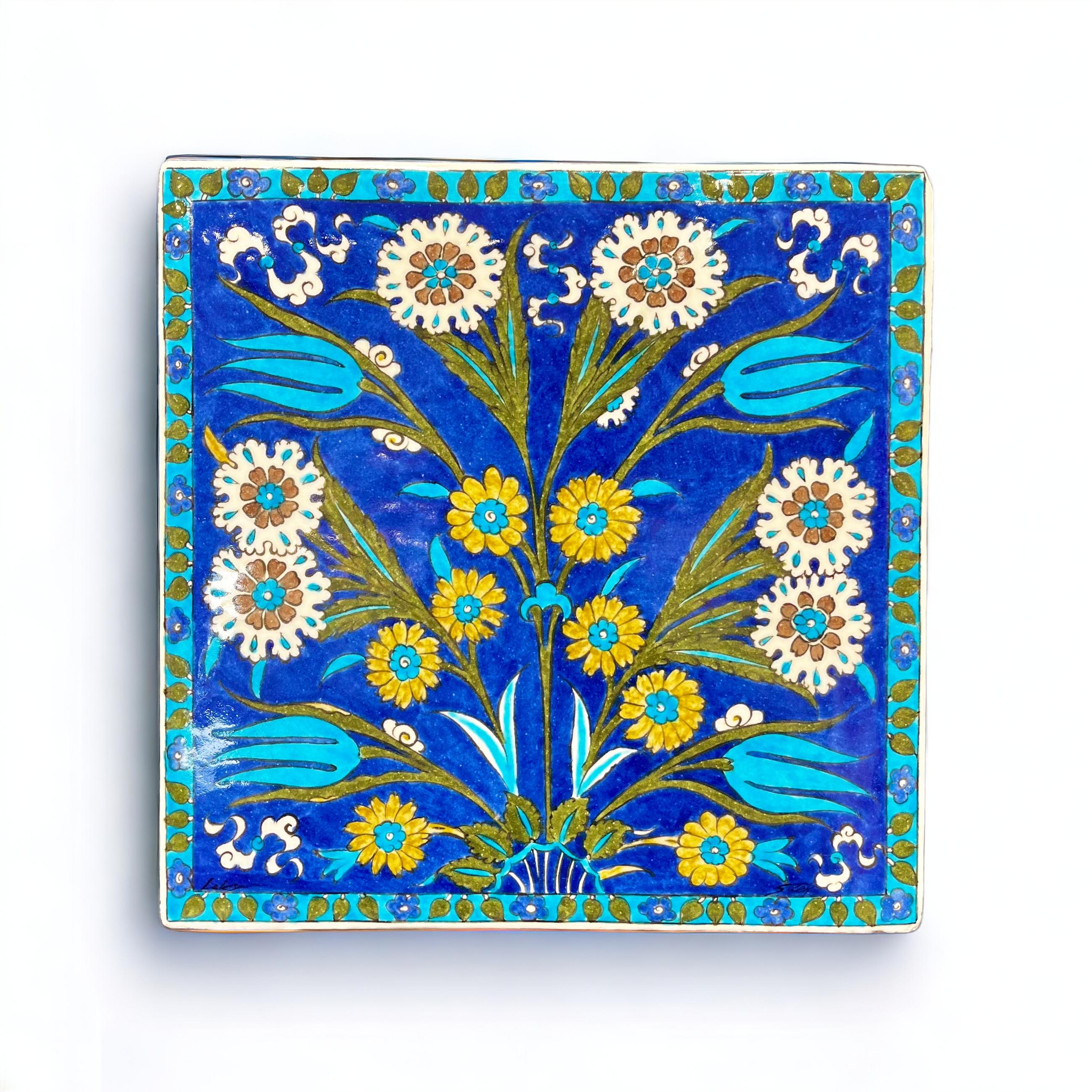 The Lalezar Iznik quartz tile features daisy and tulip designs. It's a stunning example of traditional Iznik artistry, combining floral motifs with intricate geometric patterns.