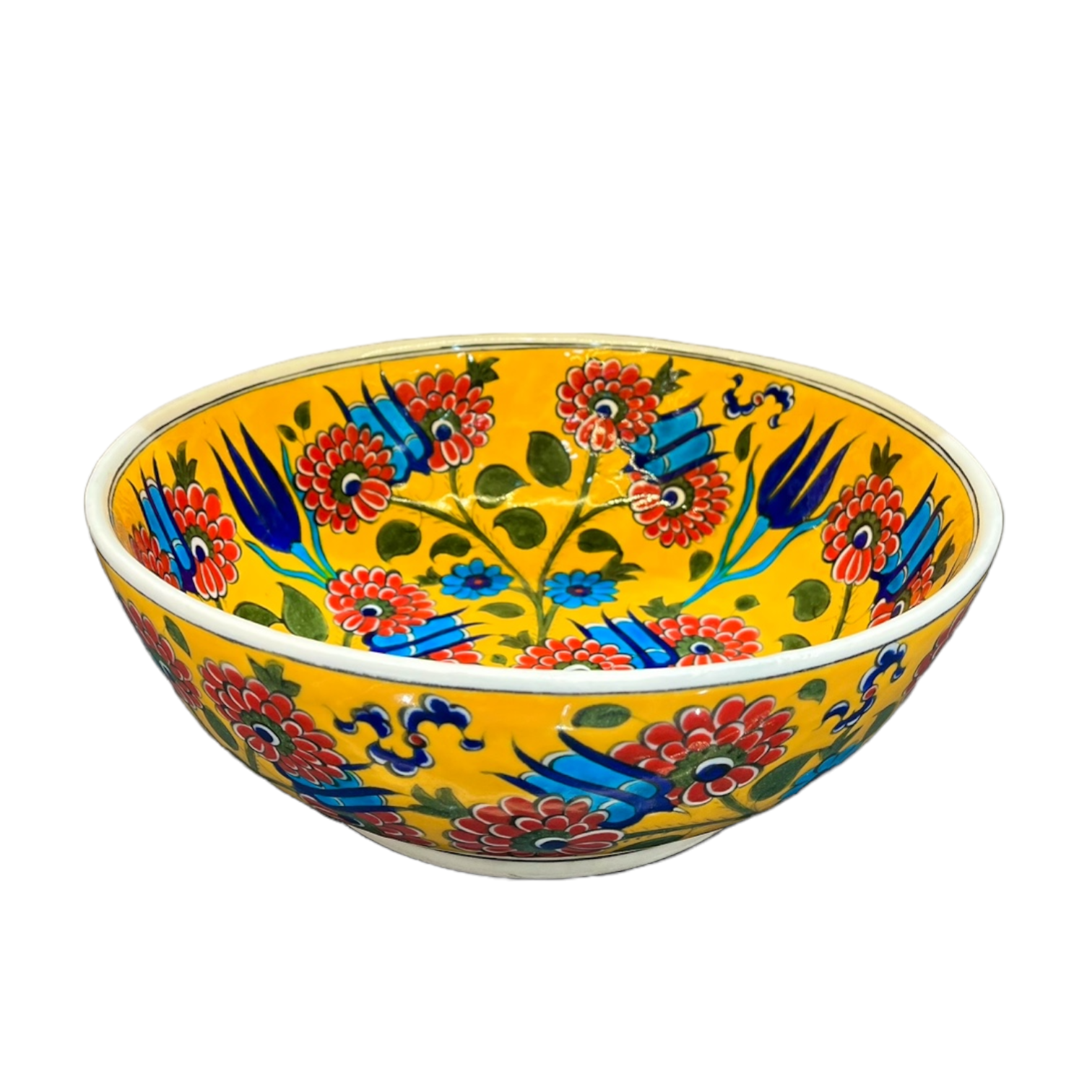 A bowl adorned with classic Iznik tulip patterns. This handcrafted item showcases an authentic example of traditional Turkish ceramic art. Tulip motifs reflect elegance and natural beauty, offering a visually striking aesthetic.