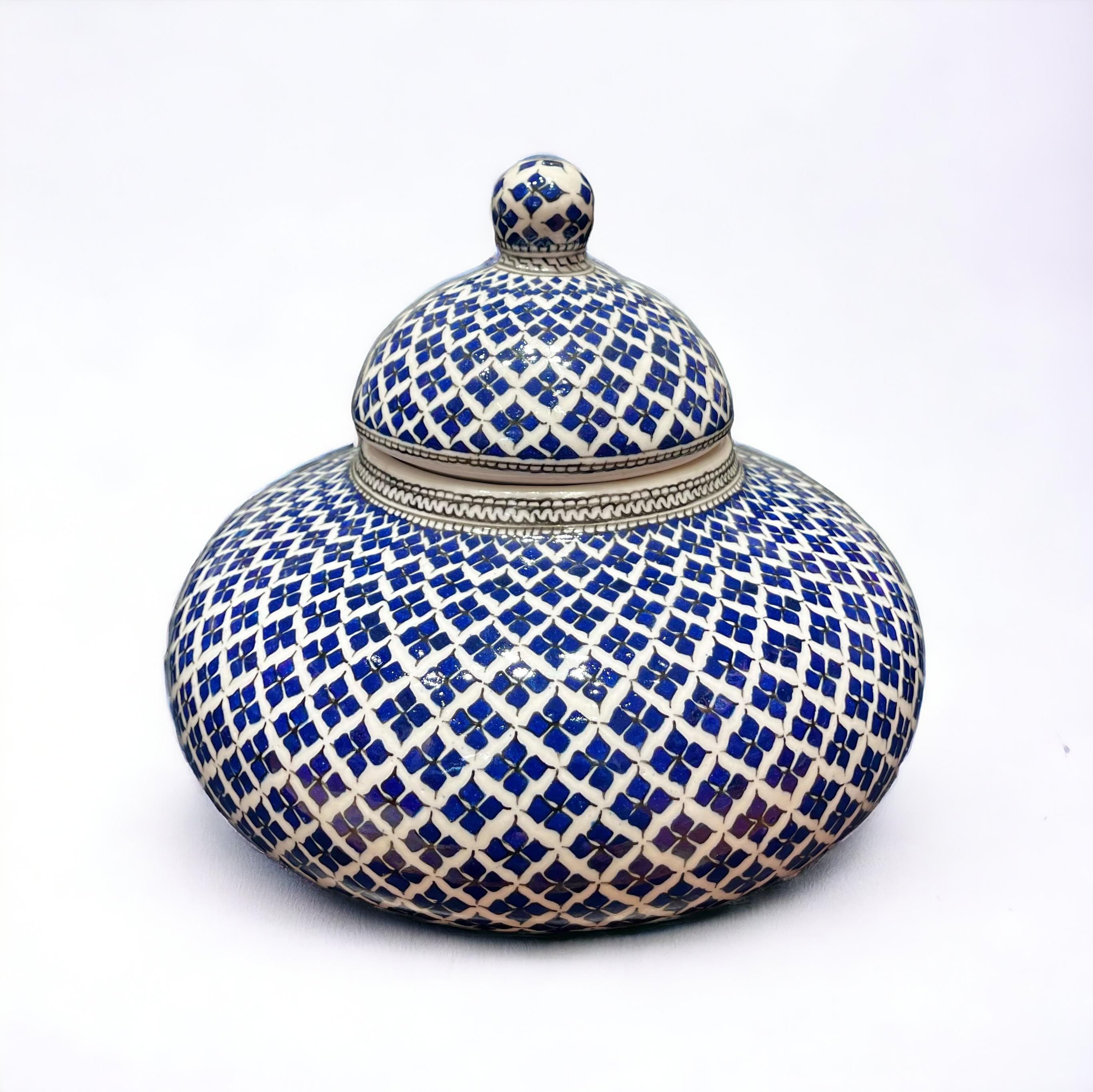 This handmade 30 cm Iznik quartz jar is adorned with geometric patterns featuring clover designs. As a fine example of traditional Iznik art, this jar holds both aesthetic and artistic value.