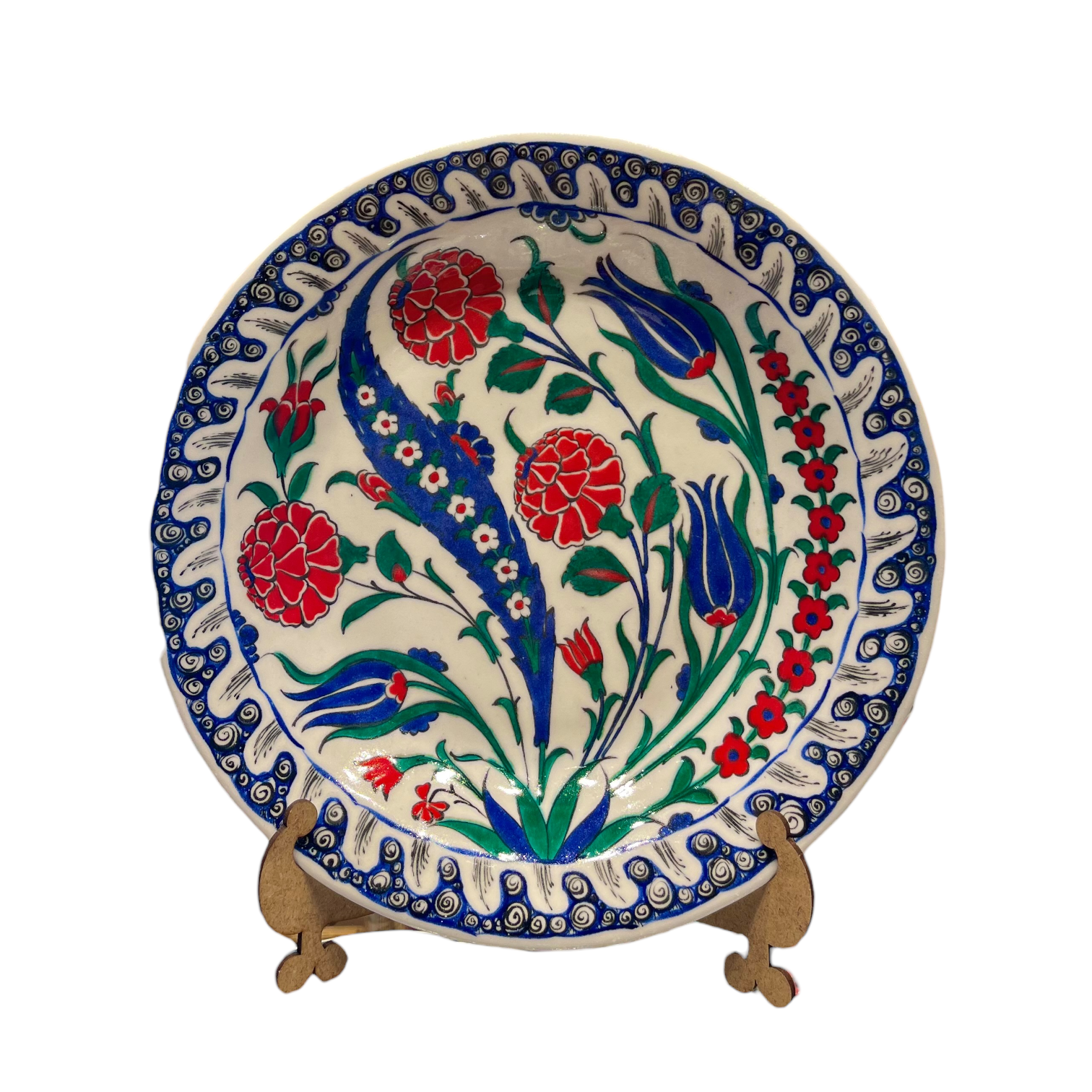 This plate is adorned with exquisite tulip and rose patterns reminiscent of Iznik ceramics. The tulip symbolizes beauty and perfection, while the rose signifies love and elegance. Handcrafted with intricate details and vibrant colors, these floral motifs bring a sense of cultural richness and aesthetic appeal to the plate.