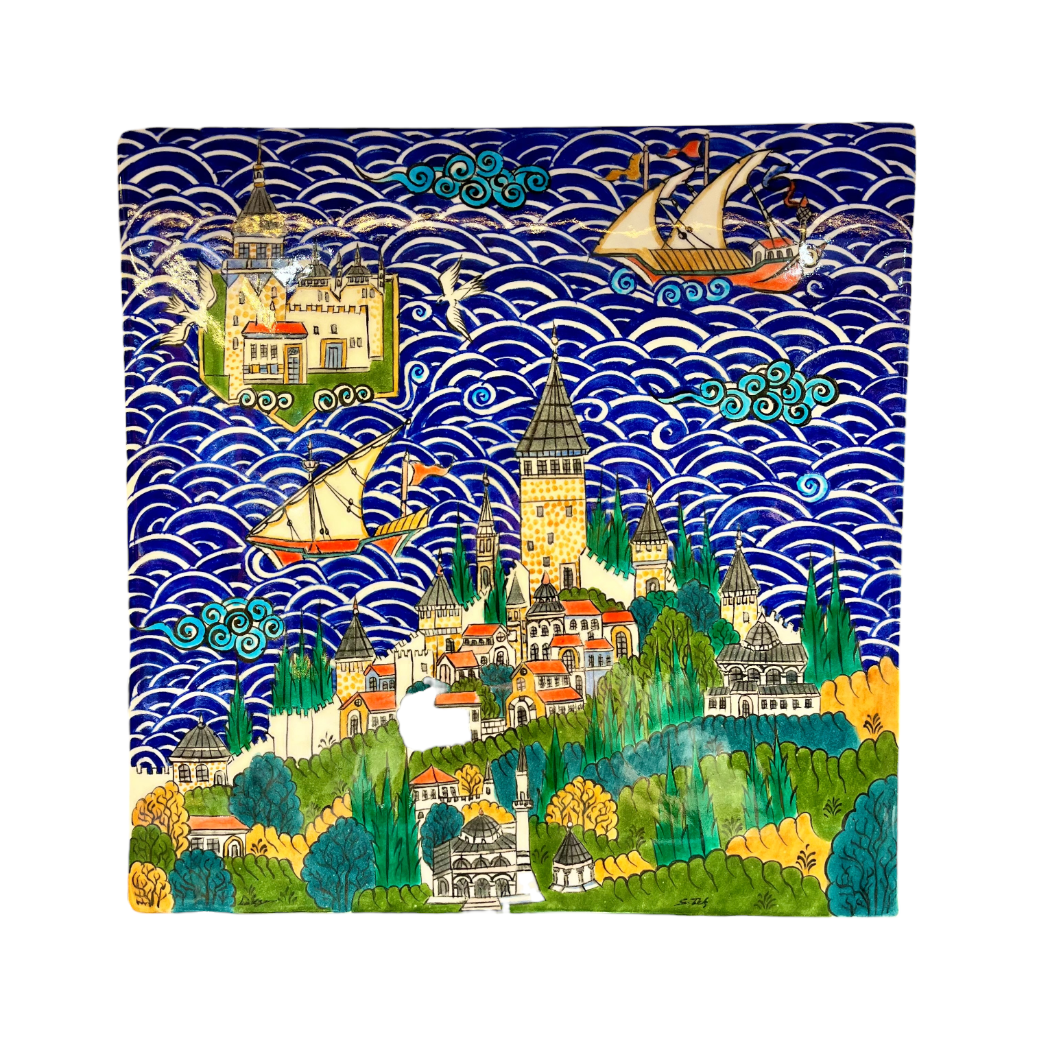 A product featuring historical landmarks of Istanbul intricately depicted on tiles. This item captures the essence of Istanbul's rich history and architectural heritage through detailed illustrations on ceramic tiles, offering a visual journey through the city's iconic sites and cultural significance.