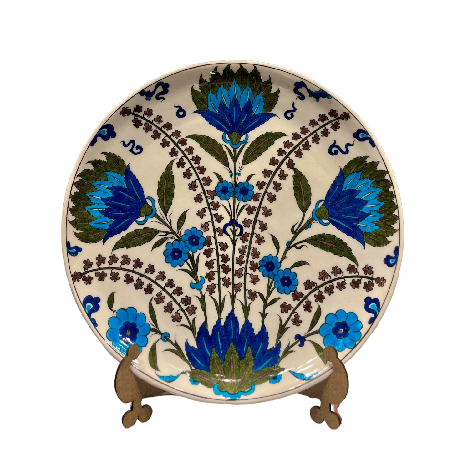 This flat plate is adorned with elegant hyacinth motifs in the Damascus style typical of Iznik ceramics. Hyacinth is recognized as a symbol of spring and renewal, while Damascus patterns combine geometric and floral elements to create aesthetic harmony. Handcrafted with intricate details, these designs enrich the plate with visual complexity.