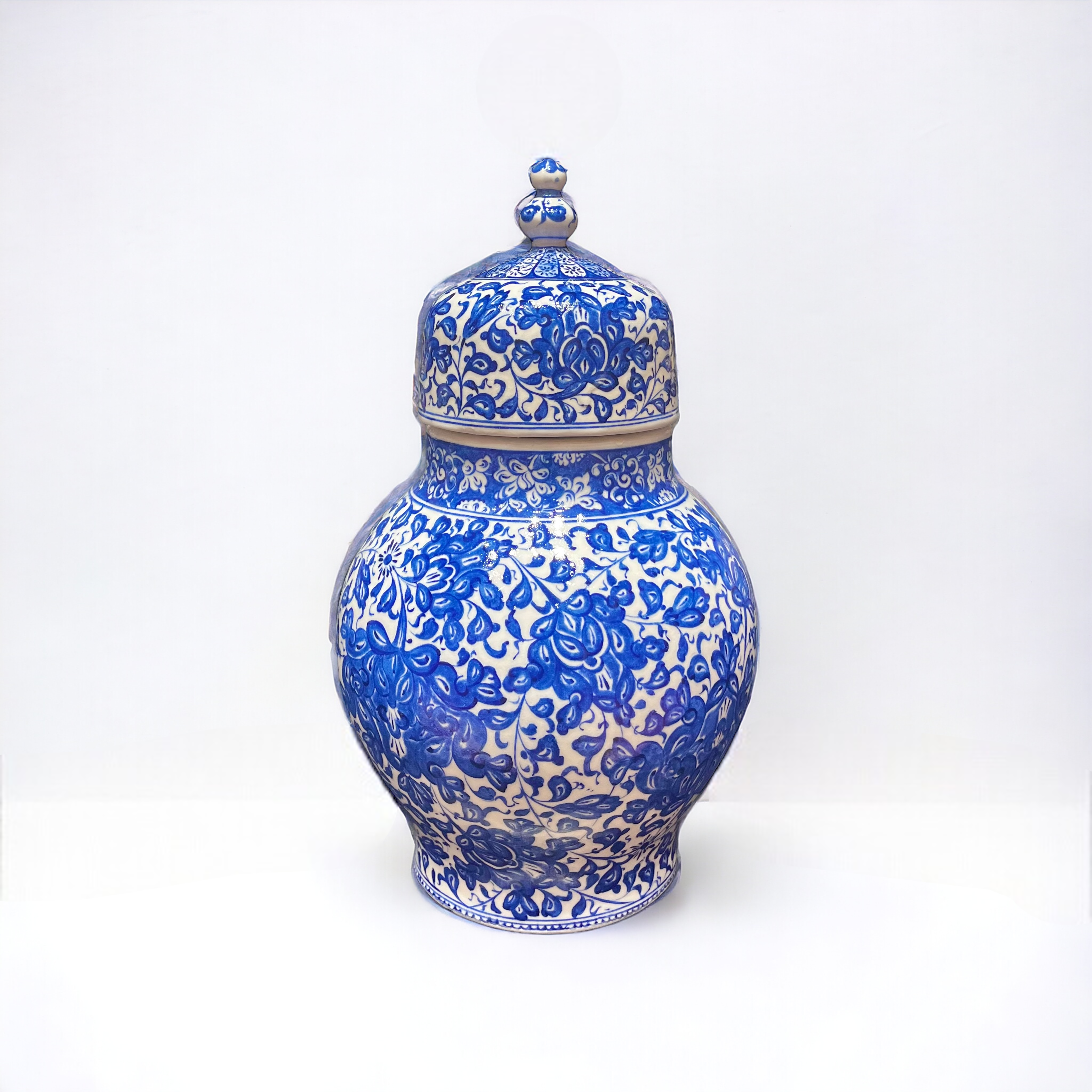 A quartz vase adorned with lotus and Rumi designs in the BabaNakkash style, reminiscent of Iznik pottery, can be described as follows: