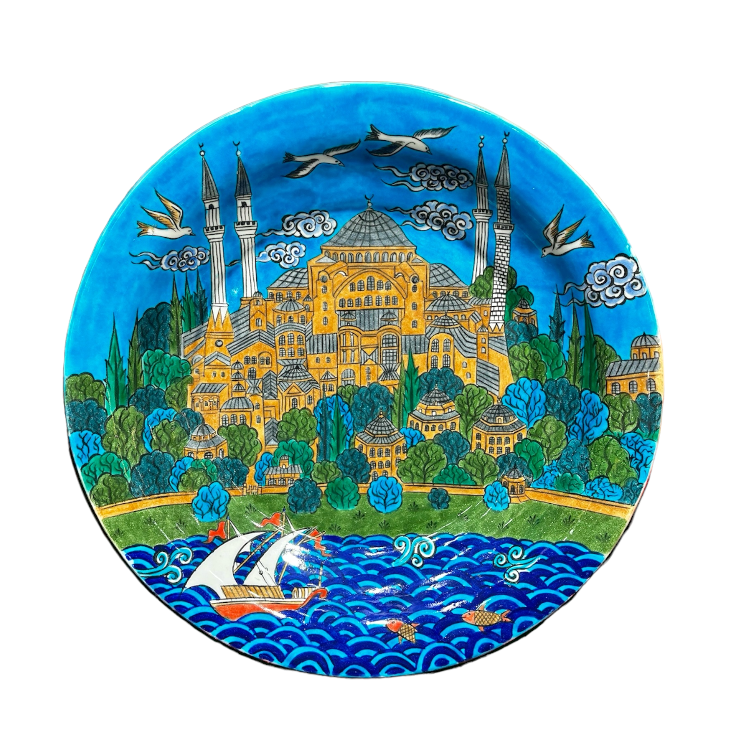 A plate featuring a design of Hagia Sophia. This piece beautifully captures the historic and architectural significance of Istanbul's iconic landmark.