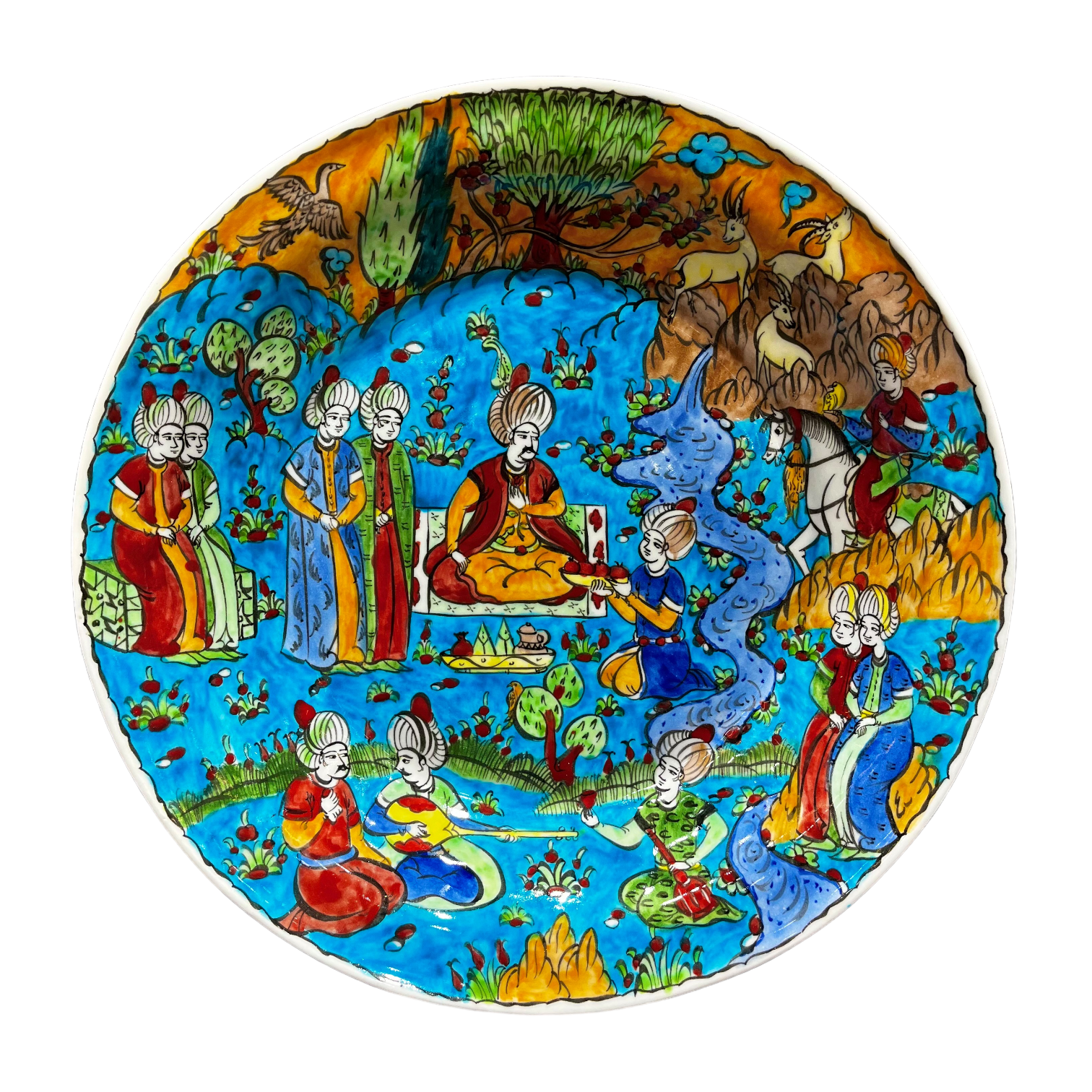 A plate featuring a miniature depiction of Sultan Süleyman and his surroundings intricately drawn inside. This product combines historical representation with artistic craftsmanship, offering a visual narrative of Sultan Süleyman's era and cultural legacy through detailed miniature artwork on a decorative plate.
