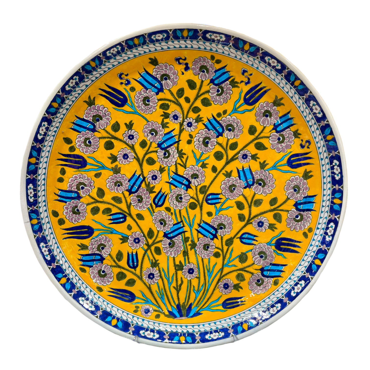 A plate adorned with tulip and daisy patterns, complemented by a matching border design. This product merges the elegance of floral motifs with a meticulously crafted border, offering a harmonious blend of aesthetic appeal and artisanal detail.
